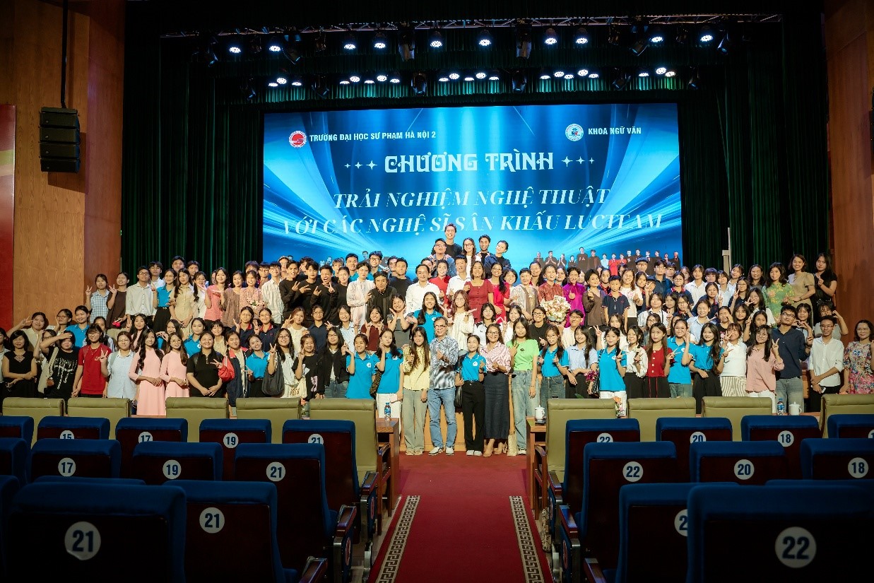 Trong nhà trường, dạy Văn không chỉ dừng lại ở việc truyền đạt tri thức, mà sâu xa hơn là khơi mở cho học sinh, sinh viên khả năng cảm thụ và thẩm thấu nghệ thuật. Văn học, với đặc trưng giàu tính hình tượng và sức gợi, luôn tiềm ẩn khả năng liên văn bản, có thể chuyển thể sang các loại hình nghệ thuật khác, đặc biệt là sân khấu. Khi một tác phẩm văn chương được thể hiện dưới ánh đèn sân khấu, nó không còn chỉ là văn bản đọc hiểu, mà trở thành trải nghiệm thẩm mỹ toàn diện – kết hợp ngôn ngữ, hình thể, âm thanh, ánh sáng và cảm xúc sống động của diễn viên. Chính sự kết nối này giúp việc dạy văn trong nhà trường vượt ra khỏi khuôn khổ sách vở, trở thành hành trình nuôi dưỡng tâm hồn, bồi đắp tư duy sáng tạo và khả năng đồng cảm nghệ thuật cho người học. Trong tinh thần ấy, buổi thực hành, trải nghiệm giữa nghệ sĩ Sân khấu LucTeam và sinh viên khoa Ngữ văn - Trường Đại học Sư phạm Hà Nội 2 ngày 18/9/2025 đã minh chứng rõ ràng cho mối quan hệ mật thiết giữa văn chương và sân khấu, mở ra cơ hội để thế hệ trẻ không chỉ học văn, mà còn sống cùng văn học qua nghệ thuật biểu diễn.