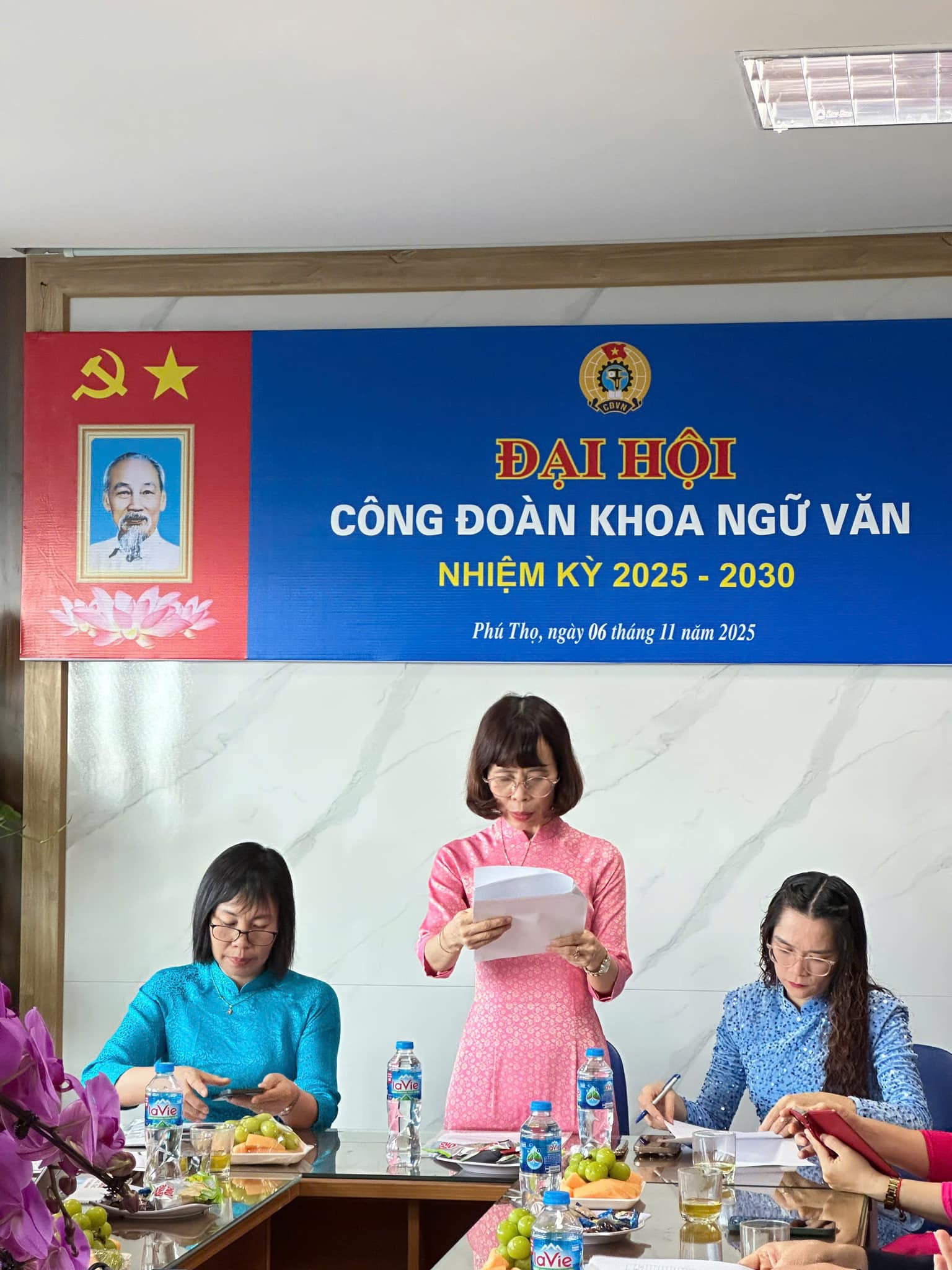 Sau nghi thức trang trọng, Đại hội đã lắng nghe Báo cáo tổng kết hoạt động nhiệm kỳ 2023-2025 của đồng chí Nguyễn Lam Châu - Chủ tịch Công đoàn Khoa Ngữ văn. Bản báo cáo đã phác họa một chặng đường đầy nỗ lực và gặt hái nhiều thành tích rực rỡ. Với 30 công đoàn viên, trong đó có 04 Phó Giáo sư, Tiến sĩ và 20 Tiến sĩ, tập thể Khoa Ngữ văn đã khẳng định vị thế vững chắc trong đào tạo và nghiên cứu khoa học. Công tác chăm lo đời sống công đoàn viên được đặc biệt chú trọng thông qua các hoạt động thăm hỏi, động viên kịp thời và duy trì hiệu quả quỹ “Mỗi người vì mọi người – Mọi người vì mỗi người”. Các hoạt động phong trào, tham quan, học tập trải nghiệm tại Nghĩa Lộ, Mũi Né, Hà Nam, Phú Thọ… đã góp phần xây dựng một tập thể đoàn kết, gắn bó. Những thành tích cá nhân và tập thể xuất sắc như Cờ thi đua của Chính phủ, Bằng khen của Bộ Giáo dục & Đào tạo,… là minh chứng sinh động cho sự phấn đấu không ngừng của cả tập thể.